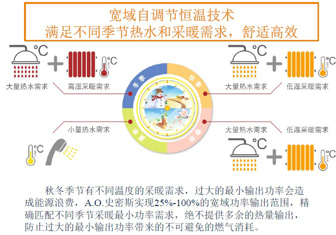 特有的電子比例閥帶來寬域線性功率調節范圍,精確匹配不同使用習慣和不同環境溫度下采暖熱需求,節能高效