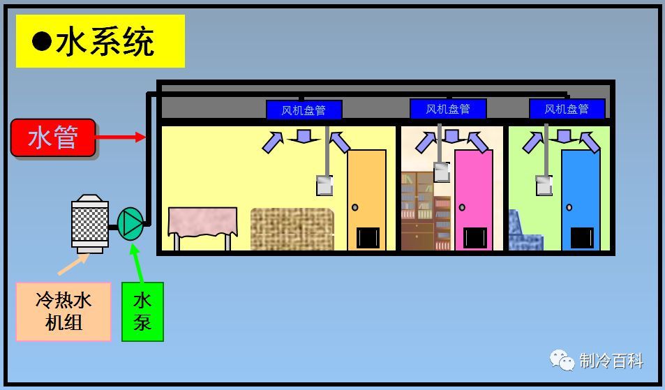 水系統:輸送介質為水,制冷時,制冷劑依次在四大部件循環,壓縮機出來的冷媒(制冷劑)高溫高壓的氣體,流經冷凝器,降溫降壓,冷凝器通過冷卻水系統將熱量帶到冷卻塔排出,冷媒繼續流動經過節流裝置,成低溫低壓液體,流經蒸發器,吸熱,再經壓縮,在蒸發器的兩端接有冷凍水循環系統,制冷劑在此次吸的熱量將冷凍水溫度降低,使低溫的水流到用戶端,再經過機盤管進行熱交換,將冷風送達室內,從而降低室內溫度。