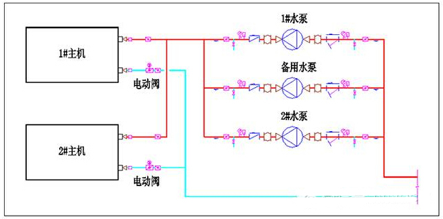 水泵互為備用,循環水集中后分到需要的每臺主機,適合做變流量系統,節能效果最好,采用變頻主機、變頻水泵以及變流量控制系統(如約克VSD,特靈的VPF)之后節能效果達到最大。管路交叉相對較少,有利于主機房設計。很多項目采用此連接方式,在機房設計安裝、運行效果和運行費用控制方面都得到甲方的好評。